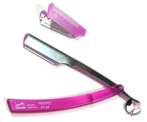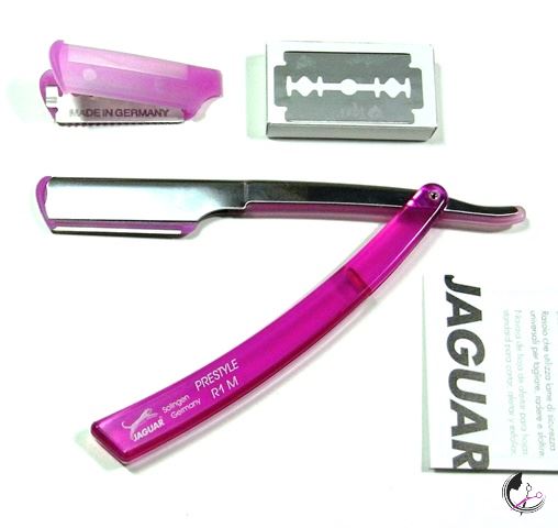 Rukojeť břitvy je plastová v růžové barvě a držák břitu je kovový.
